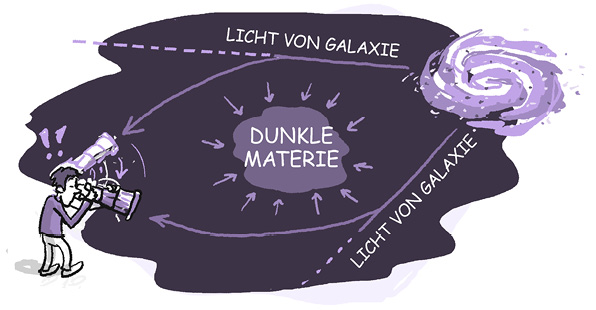 Ein weiterer wichtiger Hinweis, dass es Dunkle Materie wirklich gibt, war die Beobachtung, dass sie Licht ablenken kann. Das bezeichnet man als Gravitationslinseneffekt.