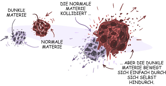 Aber den Astronomen fiel noch etwas anderes auf. Dicht neben dem Kollisionsort bemerkten sie zwei riesige Haufen Dunkler Materie; natürlich war sie unsichtbar, aber die Wissenschaftler konnten sie indirekt orten, indem sie maßen, wie stark die Haufen das Licht der hinter ihnen liegenden Galaxien ablenkten. Diese beiden Haufen Dunkler Materie schienen sich entlang der Kollisionslinie zu bewegen, als wäre nichts geschehen.