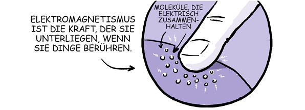 Sie können diese Kraft in der Alltagswelt tatsächlich spüren. Wenn Sie auf dieses Buch drücken, gibt es einen Grund dafür, dass Sie das Papier nicht zerdrücken oder dass Ihre Hand nicht durch das Papier fährt: Die Moleküle im Inneren des Buches sind durch elektromagnetische Bindungen eng miteinander verklammert und stoßen die Moleküle in Ihrer Hand zurück.