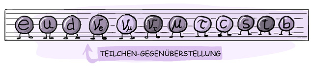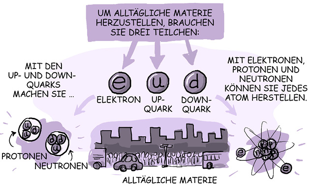 Materie, wie wir sie kennen, besteht aus Atomen der Elemente, die im Periodensystem aufgelistet sind. Jedes Atom hat einen Kern, der von einer Elektronenwolke umgeben ist. Der Kern enthält Protonen und Neutronen, die sich alle aus Up-Quarks und Down-Quarks zusammensetzen. Folglich können wir mit Up-Quarks, Down-Quarks und Elektronen jedes Element aus dem Periodensystem zusammenbauen. Was für eine Leistung! Wir haben unsere Liste der Bestandteile des Universums von unendlicher Länge zunächst auf etwa hundert Elemente des Periodensystems und dann auf lediglich drei Teilchen eingeschrumpft. Alles, was wir je gesehen, gerochen oder schmerzhaft mit dem Zeh angestoßen haben, lässt sich aus drei fundamentalen Bausteinen herstellen. Glückwunsch zu dieser kollektiven Arbeit von Millionen menschlicher Gehirne!