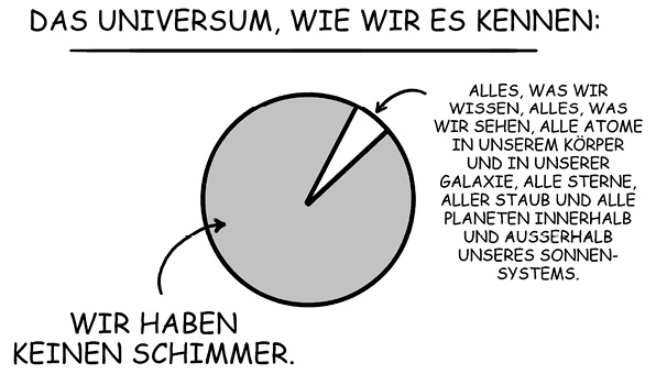 Das ist der Stand der Dinge für uns als Art. Einige Absätze zuvor haben wir uns noch zu unserer intellektuellen Meisterleistung beglückwünscht, weil es uns gelungen ist, die gesamte bekannte Materie mit einfachen Begriffen zu beschreiben. Jetzt erscheint uns diese Gratulation ein wenig verfrüht, da der größte Teil des Universums aus anderem Stoff besteht. Es ist, als hätten wir einen Elefanten seit Jahrtausenden studiert und entdeckten nun plötzlich, dass wir bisher nur seinen Schwanz betrachtet haben!