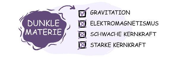 Wenn wir die vier fundamentalen Wechselwirkungsarten unserer Welt betrachten, können wir nur von einer – der Gravitation – mit Sicherheit behaupten, dass sie auch auf die Dunkle Materie zutrifft. Das ist der Grund, warum »Materie« in der Bezeichnung Dunkle Materie vorkommt. Dunkle Materie ist stofflicher Natur. Sie besitzt Masse, und wenn sie Masse besitzt, unterliegt sie der Gravitation.