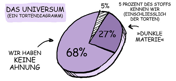 Diese Torte sieht ziemlich rätselhaft aus. Nur fünf Prozent sind Stoff, den wir kennen, darunter Sterne, Planeten und alles, was sich auf ihnen befindet. Volle siebenundzwanzig Prozent sind etwas, was wir »Dunkle Materie« nennen. Die restlichen achtundsechzig Prozent des Universums verstehen wir eigentlich überhaupt nicht. Physiker nennen sie »Dunkle Energie« und vermuten, sie bewirke die Expansion des Universums, aber das ist praktisch alles, was wir über die Dunkle Energie wissen. In späteren Kapiteln werden wir die beiden Begriffe erklären und darlegen, wie wir zu diesen exakten Zahlen gelangen.
