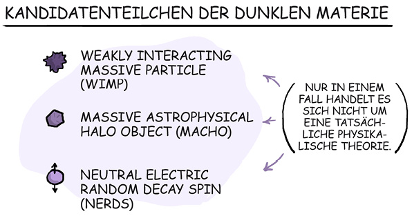 Dieses Kandidatenteilchen wird mit der Abkürzung WIMP bezeichnet – Weakly Interacting Massive Particle, »schwach wechselwirkendes massives Teilchen« (das heißt ein Teilchen mit Masse, das schwach mit normaler Materie wechselwirkt). Wir vermuten, dass es einer neuen hypothetischen Kraft unterliegt, die ihm ermöglicht, auf etwa demselben Niveau mit normaler Materie zu wechselwirken wie Neutrinos, das heißt sehr, sehr schwach. Eine Zeit lang erwog man andere Ideen, beispielsweise außerordentlich riesige Klumpen normaler Materie von der Größe Jupiters. Um sie von den WIMPs (wimp ist das englische Wort für »Schwächling« oder »Weichei«) zu unterscheiden, gab man ihnen den Spitznamen MACHOs (kompakte und massive astrophysikalische Halo-Objekte).