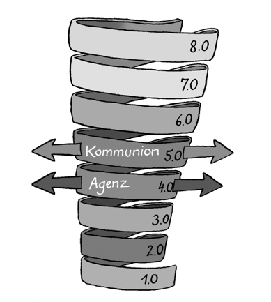 Im Gegensatz zu den transformatorischen vertikalen Prozessen verlaufen horizontale Dynamiken innerhalb einer Stufe. Durch diese Translation dehnt sich eine Stufe aus, stabilisiert sich und gewinnt an Substanz. Sie reift immer mehr aus. In gesunder Form erzeugt sie dabei eine anschwellende Kommunion im Sinne von Verantwortung, Teilhabe, Fürsorge, Güte und Einbindung in das Ganze. Eine fehlentwickelte Kommunion entsteht dagegen, wenn die Bewegungen innerhalb einer Stufe morbide Beziehungen, Unterwerfungen oder Verschmelzungen erzeugen, denen man nicht mehr entkommt. Jesus war ein Meister der Kommunion. Er band die unterschiedlichsten Menschen aus allen Schichten zusammen, ließ keine Schranken gelten, übte Fürsorge für Ausgeschlossene, Kranke und Arme. Sein Prinzip der offenen, nicht-exklusiven Tischgemeinschaft ist das große Symbol für Kommunion schlechthin. Die fehlende Abendmahlgemeinschaft der beiden großen Konfessionen verletzt Jesu Botschaft und Liebe fundamental und ist durch nichts zu entschuldigen. Sie ist auf skandalöse Weise eine morbide Verweigerung von Beziehung und Verbundenheit durch Unterwerfung unter dogmatische Regularien, die sich völlig von Jesus entfernt haben. Das kommt der Selbstaufgabe des Christlichen gleich.
