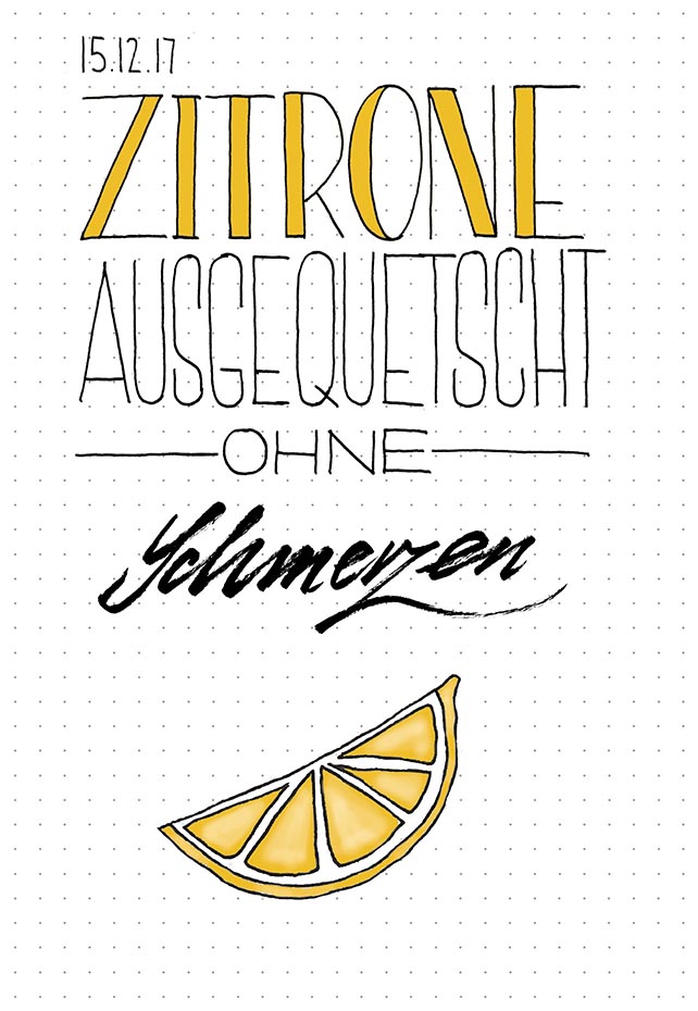 Nachdem sie ein paar Monate lang ihr Bullet Journal geführt hatte, saß sie eines Tages mit Tränen in den Augen in der Küche. Sie betrachtete ihre Hände, quetschte endlich eine Zitrone aus und merkte dabei, dass ihre Finger nicht mehr mit wunden Stellen überzogen waren. Mit jeder Linie, jedem Buchstaben und jedem Eintrag hat sie ihre Hände beschäftigt und langsam, aber sicher heilen lassen. Um diesem Tag zu gedenken, entwarf sie eine besondere Seite in ihrem Journal.
