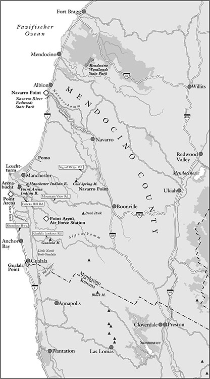 Ein paar Minuten später hatte die Sache sich im Sand verlaufen. Nicht einmal wegen überhöhter Geschwindigkeit war er belangt worden. Von der Tramperin erlöst, fuhr er allein durch Leggett und dann auf der California 1 über die Hügel, bis er wieder das Meer erreichte. Hier fing das Mendocino County an.