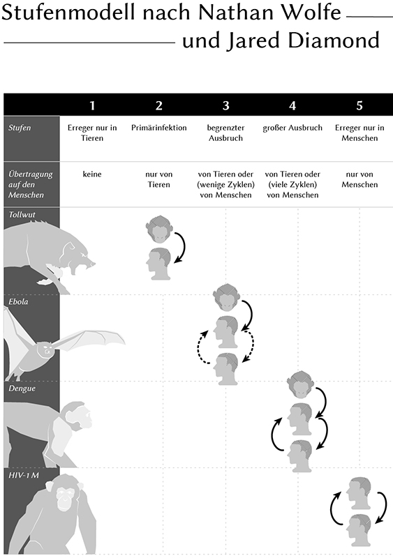 Im Süden Chinas übertragen Wasservögel immer wieder gefährliche Grippeerreger auf den Menschen. Das Sars-Virus, das Anfang des Jahrtausends auf der ganzen Welt Schlagzeilen machte und mehr als 700 Menschen tötete, war vermutlich von Schleichkatzen auf den Menschen übertragen worden. In den USA erkranken jedes Jahr einige Menschen an Lepra, nachdem sie Kontakt mit Gürteltieren hatten. Hunde, aber auch Füchse, Frettchen oder Katzen können das Tollwutvirus tragen. Menschen können an Affenpocken, Rindertuberkulose, der Papageienkrankheit oder Pferdeenzephalomyelitis erkranken. Forscher nennen diese Krankheiten Zoonosen. Die Tiere, die die Keime beherbergen, nennen sie das Reservoir. Häufig werden die Tiere selbst gar nicht krank, die Erreger schlummern in ihnen, bis sie eines Tages auf den Menschen überspringen und ihr tödliches Potenzial entfalten.