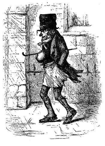 Ich bekenne mich für meinen Teil zu Toby Vecks Glauben; denn ich bin überzeugt, daß er hinreichend Gelegenheit hatte, sich eine richtige Ansicht zu bilden. was daher Toby Veck sagte, sage ich auch, und ich will auf Tobys Seite stehen, obgleich er den ganzen Tag (und das war eine mühsame Arbeit) vor der Kirchentür zu stehen pflegte. Er war nämlich Dienstmann und wartete dort auf Aufträge.