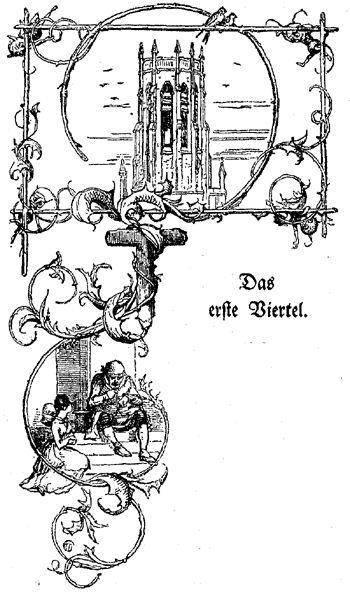 Aber erst hoch oben im Turm! Dort brüllen und pfeifen die unheimlichen Windstöße! Hoch oben im Turm, wo sie frei aus- und einziehen können durch manche luftige Öffnung, sich um die schwindelnde Treppe winden, den stöhnenden Wetterhahn umherwirbeln und sogar das Gemäuer zittern und beben lassen! Hoch oben im Turm, wo der Glockenstuhl ist, wo die eisernen Geländer sich infolge des langjährigen Rostes Schuppen; wo die Blei- und Kupferplatten , runzelig vor Alter und Wetterstürzen, unter dem ungewohnten Tritt krachen und seufzen; wo Vögel ihre Kotnester in die Ecken des alten Eichengebälks stopfen, der Staub alt und grau wird, fleckige Spinnen, während ihrer ungestörten Ruhe fett und faul geworden, gemächlich sich von den schwingenden Glocken hin und her pendeln lassen und niemals die Verbindung mit ihren gesponnenen Luftschlößchen verlieren, oder wie Matrosen in rascher Unruhe hinanklettern, wenn sie sich nicht lieber auf den Boden niederlassen, um ein Dutzend hurtiger Füße zur Rettung eines einzigen Lebens in Tätigkeit zu setzen! Hoch oben im Turm einer alten Kirche, weit über dem Licht und Gemurmel der Stadt, dennoch aber weit unter den fliegenden Wolken, die sie beschatten, ist das wilde, traurige, nächtige Plätzchen, und hoch oben im Turm einer alten Kirche hausen die Glocken, von denen ich spreche.
