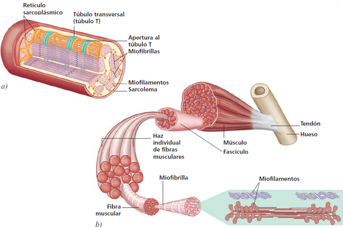 Figura 2.1 a) cada fibra de los músculos esqueléticos es una sola célula muscular cilíndrica, b) corte transversal del tejido muscular.