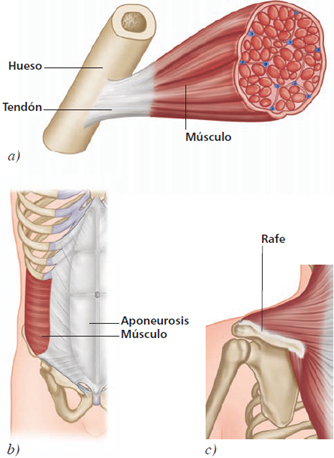 Cuando las fascias musculares (componente de tejido conectivo de un músculo) se unen y extienden más allá del extremo del músculo como cuerdas redondas o bandas planas, la fijación tendinosa se denomina tendón; si se extiende como material fino, plano y del ancho de una lámina, la fijación se llama aponeurosis. El tendón o aponeurosis fija el músculo al hueso o cartílago, a la fascia de otros músculos o a una línea de tejido fibroso llamada rafe. Pueden aparecer parches planos de tendón en el cuerpo de un músculo en los lugares en los que está expuesto a fricción. Esto puede ocurrir, por ejemplo, en la superficie profunda del trapecio, donde se roza con la espina de la escápula.