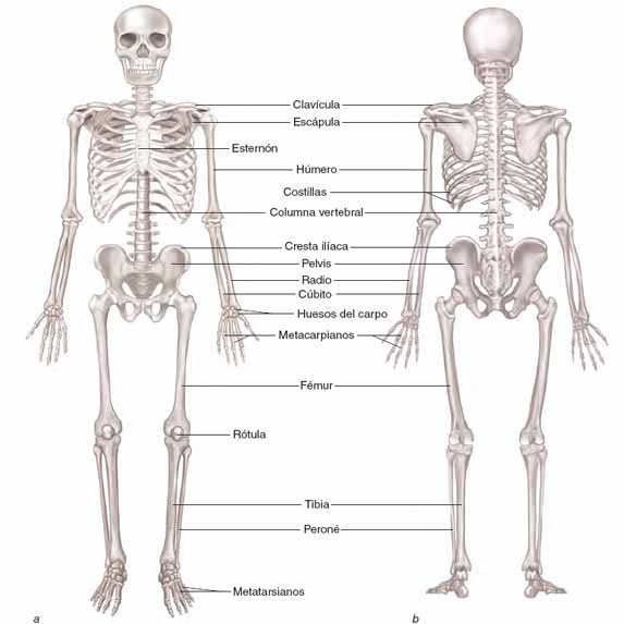 FIGURA 1.1 Vistas anterior (a) y posterior (b) del esqueleto de un varón adulto.