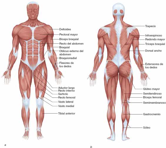 FIGURA 1.2 Vistas anterior (a) y posterior (b) de la musculatura esquelética.