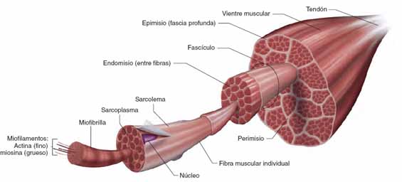 Las células musculares, llamadas fibras musculares, son células largas (a veces de longitud pareja a la de todo el músculo), cilíndricas y con un diámetro de 50 a 100 μm (el grosor de un cabello humano). Estas fibras contienen muchos núcleos situados en la periferia de la célula, y su aspecto es estriado cuando se observan bajo un microscopio óptico. Debajo del epimisio las fibras musculares se agrupan en haces (fascículos) de hasta ciento cincuenta fibras, y estos haces están rodeados por tejido conjuntivo llamado perimisio. Las fibras musculares están rodeadas individualmente por tejido conjuntivo llamado endomisio, circundado y contiguo al sarcolema o membrana de la fibra (13). Todo el tejido conjuntivo —epimisio, perimisio y endomisio— es contiguo al tendón, por lo que la tensión que desarrolla la célula muscular se transmite al tendón y al hueso en que se inserta (figura 1.3).