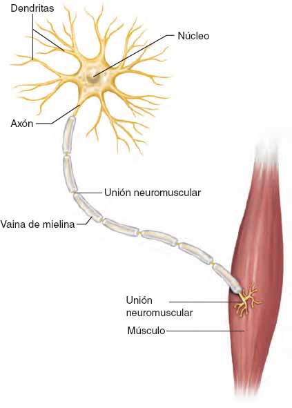 La unión entre una motoneurona (célula nerviosa) y las fibras musculares que inerva recibe el nombre de placa motora terminal o, con más frecuencia, unión neuromuscular (figura 1.4). Si bien las células musculares solo tienen una unión neuromuscular, una sola motoneurona inerva muchas fibras musculares, a veces cientos o incluso miles. Una motoneurona y las fibras musculares que inerva forman una unidad motora. Todas las fibras musculares de una unidad motora se contraen a la vez cuando las estimula la motoneurona.