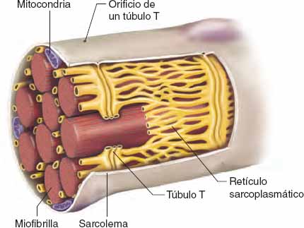 Paralelo a cada fibrilla y rodeándola hay un intrincado sistema de túbulos que se denomina retículo sarcoplasmático (véase la figura 1.5) y que termina en vesículas en la proximidad de las líneas Z. Iones de calcio se almacenan en las vesículas. La regulación del calcio controla las contracciones musculares. Los túbulos T, o túbulos transversos, cursan perpendiculares al retículo sarcoplasmático y terminan en la proximidad de la línea Z entre dos vesículas. Como los túbulos T discurren entre miofibrillas periféricas y son contiguos al sarcolema en la superficie de la célula, la descarga de un potencial de acción (un impulso nervioso eléctrico) llega casi simultáneamente de la superficie a todos los niveles de la fibra muscular. Por tanto, se libera calcio en el músculo y se produce una contracción coordinada.