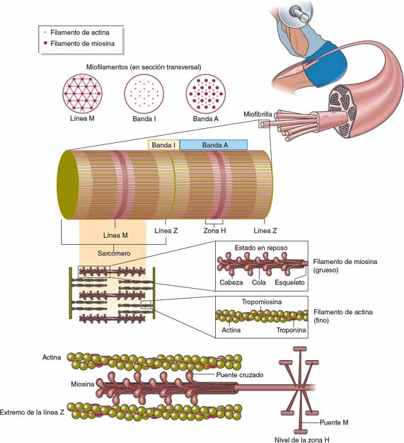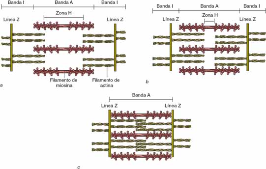 Es la configuración de los filamentos de actina y miosina y la de las líneas Z de los sarcómeros la que confiere al músculo esquelético su alternancia de líneas oscuras y claras, así como su aspecto estriado bajo el microscopio óptico. La oscura banda A se corresponde con la alineación de los filamentos de miosina, mientras que la banda I, de apariencia más clara, se corresponde con las áreas de dos sarcómeros adyacentes que contienen solo filamentos de actina (13). La línea Z se localiza en medio de la banda I y semeja una línea fina y oscura que discurre longitudinalmente a través de la banda I. La zona H es el área situada en el centro del sarcómero donde solo hay filamentos de miosina. Durante la contracción muscular, la zona H mengua cuando la actina se desliza sobre la miosina hacia el centro del sarcómero. La banda I también disminuye cuando las líneas Z son arrastradas al centro del sarcómero.