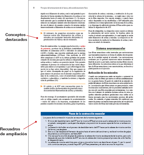 Todos los capítulos empiezan con los objetivos y puntos clave para que el lector se desenvuelva bien con la lectura. Los términos clave se recalcan en negrita y aparecen en una lista al final de los capítulos. Los capítulos incorporan recuadros en los que se muestra la aplicación práctica del contenido, mientras que capítulos posteriores contienen muestras de programas de entrenamiento resistido para tres deportes distintos. Se suministran instrucciones detalladas y fotografías sobre las pruebas, los estiramientos, el entrenamiento resistido, los modos alternativos de ejercicio, los ejercicios pliométricos, el entrenamiento de agilidad y el ejercicio aeróbico de fondo. Por último, los capítulos concluyen con preguntas de opciones múltiples cuyas respuestas aparecen al final del libro.