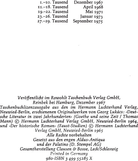 Die Aufdeckung dieser Zusammenhänge geht schon deshalb über den Rahmen dieses Vorworts hinaus, weil auch unser Buch nicht den Anspruch erhebt, diesen Fragenkomplex von allen Seiten umfassend darzulegen. Deshalb werde ich auf jene Fragen, die spezifische Eigentümlichkeiten der deutschen Entwicklung des 19. Jahrhunderts sind, erst in meinen Studien über die deutschen Realisten dieser Periode ausführlich eingehen.[*] Hier kann ich nur einen kurzen Abriß jener entscheidenden Fragen geben, um welche sich die reaktionäre Verfälschung der klassischen deutschen Literaturgeschichte dreht, damit die Leser dieses Buches klar sehen können, was der Kampf zwischen Fortschritt und Reaktion in diesem Abschnitt der deutschen Entwicklung bedeutet.