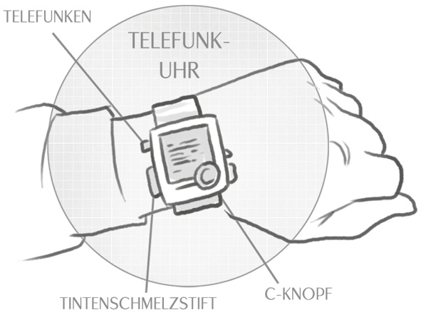 Das einzige technische Gerät, das Jack immer bei sich trägt, sogar wenn er nicht als Geheimagent unterwegs ist. Die Telefunk-Uhr ist das zentrale Steuerungsgerät und sorgt dafür, dass die anderen Geräte reibungslos arbeiten. Sie hat viele wichtige Funktionen, am wichtigsten ist der C-Knopf, der den Code des Tages verrät. Ihn braucht Jack, um den Geheimagenten-Rucksack zu öffnen. Auf beiden Seiten der Uhr gibt es Schalter, einer aktiviert zum Beispiel den lebenswichtigen Tintenschmelzstift. Außer diesen Funktionen kann man mit der Uhr auch telefonieren und natürlich die Zeit ablesen.