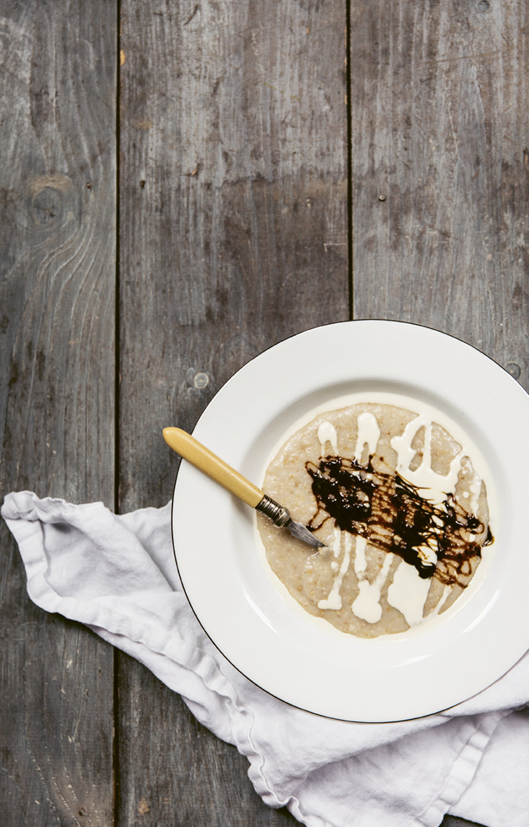 3. Den Haferbrei in eine Schüssel schöpfen und mit der Sahne und der Melasse beträufeln. Sofort aufessen.