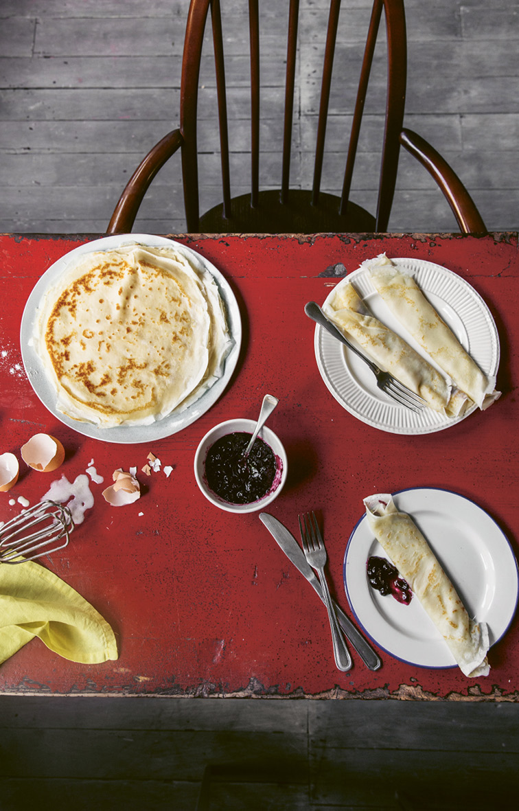 Obwohl Pfannkuchen in Pippis Heimat Schweden die traditionelle Donnerstagsnachspeise sind, esse ich sie am liebsten zum Frühstück. Pannkakor sind weder zu süß noch zu sättigend, und nach gerade mal fünf Minuten liegen schon die ersten auf dem Teller. Außerdem gelingen sie immer. Während meiner Zeit als Kindermädchen waren sie die Geheimwaffe, mit der ich meine Schützlinge morgens aus dem Bett und an den Frühstückstisch locken konnte.