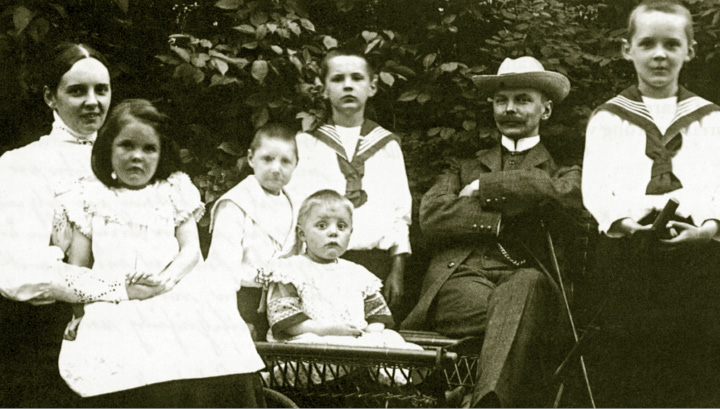 Die Familie, von links nach rechts: Mutter Elisabeth mit Tochter Maria, Hans, Hugo, Vater Georg, Bernhard Lassalle; im Wagen Vetter Willi Engelhardt