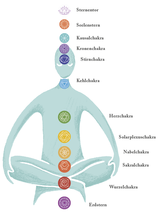 In diesem Buch konzentrieren wir uns auf die sieben Haupt- sowie die Chakras »höherer Energie«, die sich derzeit neu entwickeln. Dabei handelt es sich um den Erdstern, das Nabelchakra sowie das Himmelstrio Kausalchakra, Seelenstern und Sternentor.