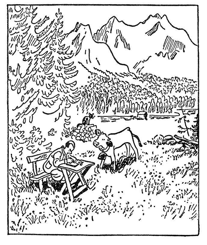 Abends holt mich regelmäßig Eduard ab. Eduard ist ein bildhübsches, braunes Kalb mit winzigen Hörnern. Man hört ihn schon von weitem, weil er eine Glocke umhängen hat. Erst läutet es ganz von ferne; denn das Kalb weidet oben auf einer Bergwiese. Dann dringt das Läuten immer näher und näher. Und schließlich ist Eduard zu sehen. Er tritt zwischen den hohen, dunkelgrünen Tannen hervor, hat ein paar gelbe Margeriten im Maul, als hätte er sie extra für mich gepflückt, und trottet über die Wiese, bis zu meiner Bank.