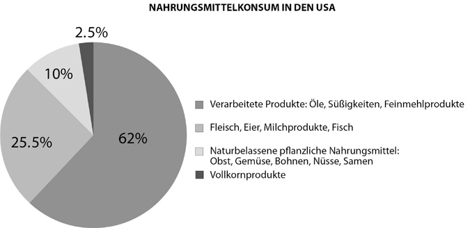 Ein US-Amerikaner nimmt heute über 60 Prozent seiner Kalorien in Form von verarbeiteten Produkten zu sich. Dieser Prozentsatz ist in den letzten 100 Jahren allmählich, aber unaufhaltsam gestiegen. In diese Kategorie gehören die meisten Nahrungsmittel, die Süßstoffe, Weißmehl und Öle enthalten, zum Beispiel Weißbrot, Brötchen, Chips, Nudeln, Kuchen, Kekse, Müsliriegel, Frühstücksflocken, Limonaden, Brezeln, Würzmittel und Fertigsoßen für Salate. Diese verarbeiteten Produkte enthalten meist Zusatzstoffe, Farbstoffe und Konservierungsstoffe, um die Haltbarkeit zu verlängern, und sie werden in Plastikbeuteln oder Schachteln aus Karton verkauft.