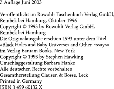 In diesem Band sind Arbeiten gesammelt, die ich zwischen 1976 und 1992 geschrieben habe – autobiographische Skizzen, wissenschaftsphilosophische Überlegungen und Versuche zu erklären, warum mich die Physik und das Universum so faszinieren. Das Buch endet mit der Abschrift der «Desert-Island-Discs»-Sendung, zu der ich eingeladen war. Diese Radiosendung ist eine typisch britische Institution, bei der jeweils ein Gast gebeten wird, sich vorzustellen, es würde ihn auf eine einsame Insel verschlagen und er dürfe sich acht Schallplatten aussuchen, um sich mit ihnen die Zeit bis zu seiner Rettung zu vertreiben. Glücklicherweise mußte ich nicht allzu lange warten, bis ich wieder in die Zivilisation zurückkehren durfte.