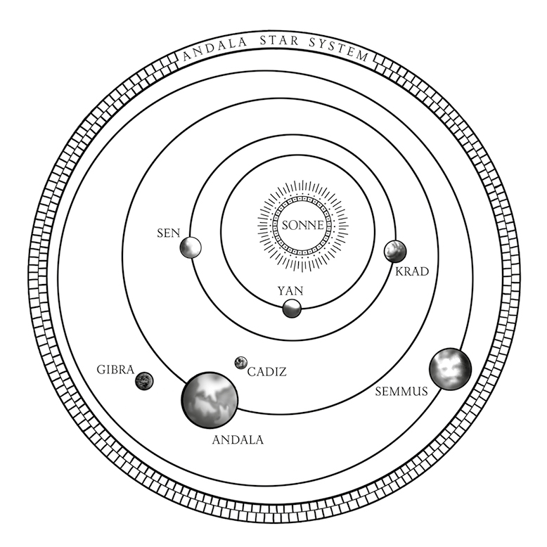 Ich folgte der Reihe von anderen Mädchen und deren Müttern durch den Hof, zwischen den Familien hindurch, die uns anschauten, lachten und Glückwünsche heulten, zu einem Bankett-Tisch am Nordende. Diejenigen von uns, die heute Abend gefeiert wurden, sollten vorn an dem Tisch sitzen, zusammen mit den alten Frauen aus dem Dorf und unseren Müttern. Als ich sie plaudern hörte, wurde mir das Herz leichter. Auf unserem kleinen Mond gab es sonst keinen Ort für solche Zusammenkünfte. Die meisten von uns waren Kushaila, Angehörige der ältesten Stammesgruppe auf Andala. Meine Familie war nicht die einzige, deren Linie sich bis zum Terraforming unseres Monds zurückverfolgen ließ. Überall hörte man unsere Muttersprache anstelle von Vathekaar, unsere Musik und unser Lachen. Für einen Moment könnte ich mir einreden, in eine andere Zeit zurückversetzt zu sein, Jahrzehnte bevor der Schatten der Vath auf unseren Mond fiel und unseren Planeten und sein System eroberte.
