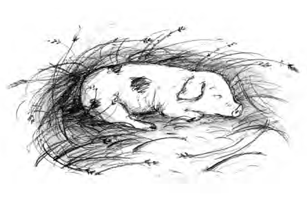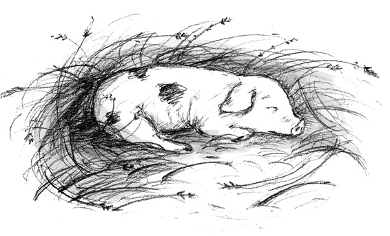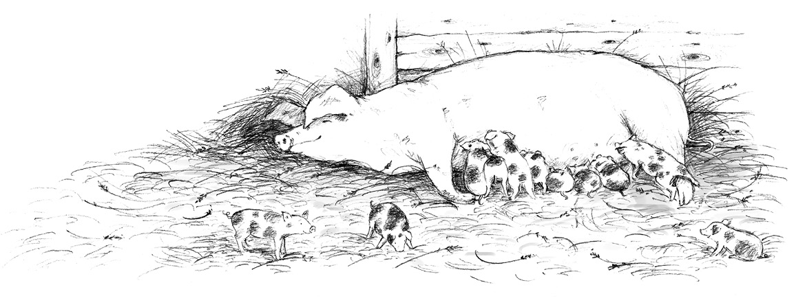 Langsam und ruhig, damit sie weder die saugenden Babys noch die frischgebackene Mutter störte, schlich sie an den Ferkeln entlang bis zu dem dicksten Schweinchen, das direkt vor dem Hinterbein seiner Mutter lag.
