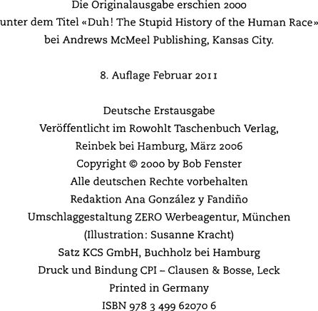 Später im zweiten Teil, «Was Sie schon immer über Dummheit wissen wollten, aber nicht fragten, weil Sie zu klug sind», analysieren wir die Erfolgsgeschichte der Spezies Mensch und taumeln vom Streben nach Ruhm in die Zwangsläufigkeit dummer Konsequenzen.