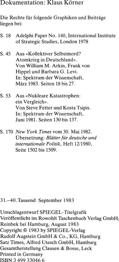 Eine solche Sicherheitspolitik birgt Risiken in sich, vermeidet aber den atomaren Selbstmord. Da Atomwaffen Waffen sind, die keine Sicherheit garantieren können, und da sie mit zwingender Notwendigkeit die Atomwaffen der anderen Seite auf sich ziehen, wird die Entnuklearisierung der Bundesrepublik gefordert. Die Gleichgewichtsformel ist heute noch Grundlage der Genfer Verhandlungen der beiden Weltmächte. In einer Welt, in der es einige hundert Atombomben gab, hatte diese Gleichgewichtsformel vielleicht noch einen Sinn. Da heute über 50000 Atombomben in den Waffenarsenalen der Nuklearmächte lagern, ist die Gleichgewichtsformel sinnlos geworden. Sie kann daher nicht Grundlage einer rationalen Politik sein.