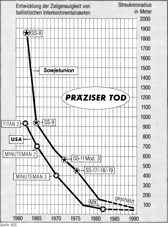 In den Folgejahren veränderte sich der wichtige technische Parameter Treffgenauigkeit entscheidend. Die Treffgenauigkeit bestimmt die Zerstörungsfähigkeit einer Atomwaffe. Insbesondere die Steigerung der Treffgenauigkeit vom Kilometer-Bereich in den Zehn-Meter-Bereich begründete die Fähigkeit, auch Raketensilos und Kommandozentralen der anderen Weltmacht zu zerstören. Die Grafik auf Seite 18 gibt einen Überblick über die tatsächliche und zukünftig mögliche Entwicklung der Zielgenauigkeit von Raketen.