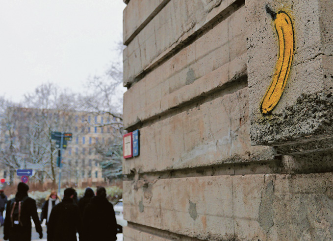 Und reden wir nicht darum herum, die Banane nährt auch die erotische Fantasie, überhaupt künstlerische Fantasien. Natürlich ist es ein deutscher Künstler, der weltweit als »Bananensprayer« bekannt geworden ist. Der vom Niederrhein stammende Thomas Baumgärtel sprüht seit 1986 ungefragt Bananen an die Fassaden von bisher etwa viertausend Kunstmuseen und Galerien im In- und Ausland und etablierte so die Banane als Symbol für Kunst.