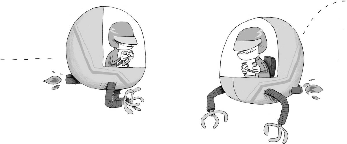 Ich schloss die Augen und sog den Sauerstoff in gleichmäßigen Zügen tief in meine Lunge. Ich stellte mir vor, wie sich kleine Luftblasen ihren Weg durch meine Luftröhre bahnten und anschließend in die unzähligen Verästelungen meiner Lunge abbogen. In den Bläschen saßen mikroskopisch kleine Astronauten in blauen Anzügen, die Steuerknüppel in den Händen hielten. Die Luftblasen-Raumschiffe hatten vorne kleine Greifarme, mit denen sie aus den Tiefen meiner Lunge fiese Viren holten, die dann wild zappelnd und schimpfend mit jedem Ausatmen nach draußen befördert wurden. Diese Viren sahen echt übel aus. Ihre von Warzen übersäten runden Körper waren giftgrün, sie hatten leuchtend rote Augen und aus ihrem Gebiss mit den vielen kleinen, spitzen Zähnen lief glibberiger Sabber. Doch die Luftblasen-Raumschiffe machten ganze Arbeit und ließen den Eindringlingen keine Chance.