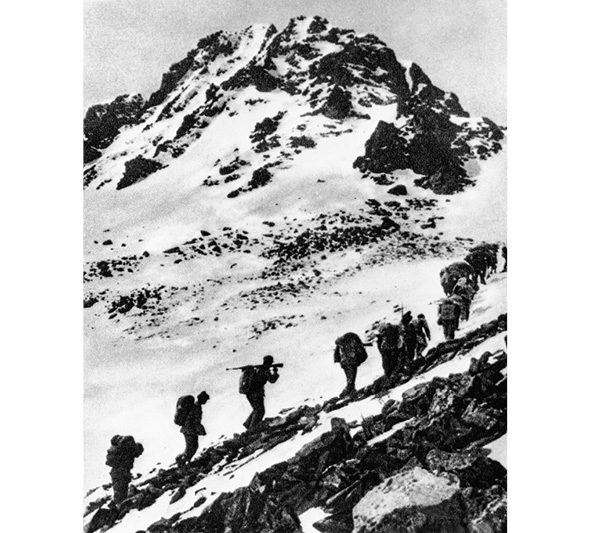 Die chinesische Rote Armee auf dem Weg ins Hochland von Tibet, unterhalb des Berges Jiajin Shan, Juni 1935.