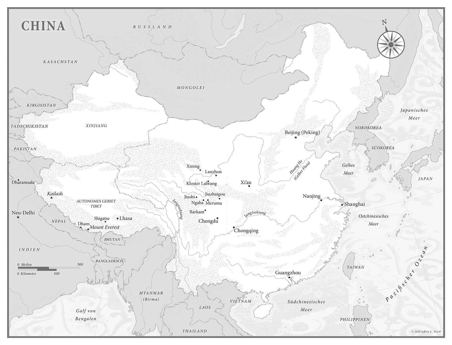 Hier noch ein paar Worte zur Geografie: Nur eine Hälfte des Tibetischen Hochlands gehört aus Gründen, die ich später im Text erläutern werde, zu der von der chinesischen Regierung als Autonomes Gebiet Tibet bezeichneten Region. Die Mehrheit der Tibeter lebt jedoch in Teilen der Provinzen Sichuan, Qinghai, Gansu und Yunnan, die zwar nicht zum »offiziellen Tibet« gehören, aber trotzdem tibetisch sind. Zudem haben sich diese östlichen Ausläufer der Hochebene in den letzten Jahrzehnten zum Kernland Tibets entwickelt und einen überproportional hohen Anteil an berühmten tibetischen Musikern, Filmregisseuren, Autoren, Aktivisten und Lamas – darunter den gegenwärtigen Dalai Lama – hervorgebracht.