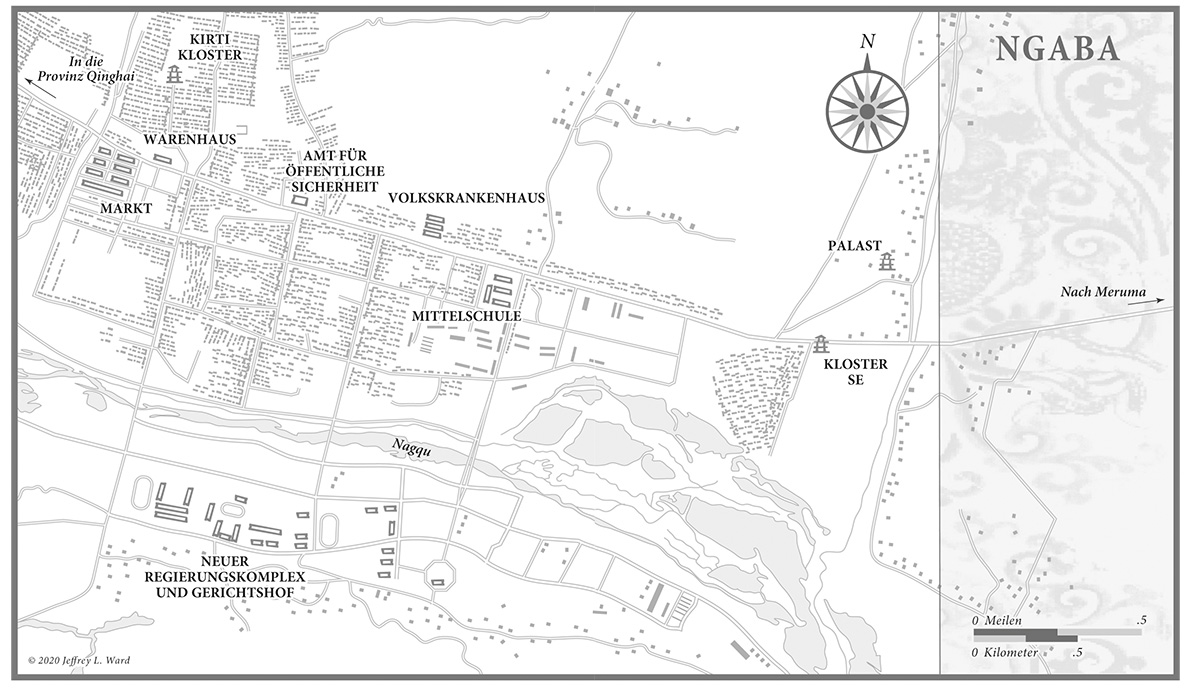 Die Fortschrittshörigkeit Chinas hat Ngaba den gleichen Stempel aufgedrückt wie unzähligen anderen Städten des Landes auch. Die Schilder werben für die staatseigene Volksbank, den staatseigenen Benzinkonzern und das staatseigene Telekommunikationsunternehmen. Ngaba ist eine Kreisstadt (und hat rund 15000 Einwohner, während der Landkreis ungefähr 73000 zählt) mit dem üblichen Komplex fader Verwaltungsgebäude, einem Krankenhaus, einer großen Mittelschule, den Stützpunkten der Polizei und der Sicherheitskräfte – alle auffällig mit roten Fahnen geschmückt. Nichts unterscheidet Ngaba von sonstigen Kreisstädten, außer der höheren Zahl von Streifenwagen und Militärfahrzeugen. Vor dem einzigen Warenhaus der Stadt steht oft ein gepanzerter Mannschaftswagen. Überwachungskameras zeichnen die Nummernschilder der Autos auf, die in die Stadt hineinfahren und die sie wieder verlassen. Immer wieder rollen mit grünen Planen bespannte Lkws des Militärs die Hauptstraße entlang, auf dem Weg von oder zu ihrem Stützpunkt jenseits des Klosters Kirti. Bei einer Zählung stellte man fest, dass in Ngaba ungefähr 50000 Sicherheitskräfte stationiert sind, etwa das Fünffache dessen, was für einen Ort dieser Größe normal ist.
