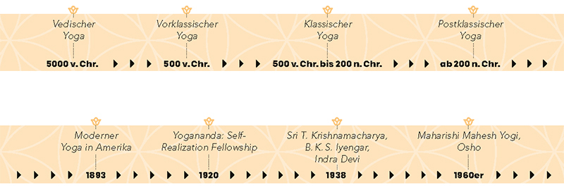 Das Zeitalter des modernen Yoga begann vor allem mit dem Weltparlament der Religionen 1893 in Chicago. Dort hinterließ der junge Swami Vivekananda einen großen und anhaltenden Eindruck auf Amerikas Öffentlichkeit. Darauf folgte Paramahansa Yogananda, der bekannteste Lehrer in der westlichen Yoga-Bewegung. 1920 etablierte er die Self-Realization Fellowship mit Hauptsitz in Los Angeles. Seine »Autobiografie eines Yogi« ist ein Yoga-Klassiker und absolut lesenswert. Yoga in Form von Hatha Yoga betrat »Mainstream-Amerika«, als die russische Yogini Indra Devi, bekannt als die »erste Dame des Yoga« und Schülerin von Sri Tirumalai Krishnamacharya, 1947 ihr Studio in Hollywood eröffnete. Sie unterrichtete Stars, bildete Hunderte von Lehrern aus und prägte als einflussreiche Stimme den Weg des modernen Yoga. Mitte der 1960er erfuhr die Yoga-Bewegung einen Schwung durch Maharishi Mahesh Yogi, v. a. wegen seiner Bekanntschaft mit den Beatles. Er machte yogische Besinnung in Form von transzendentaler Meditation (TM) bekannt, die noch heute Zehntausende Anhänger weltweit zählt. Bhagwan Shree Rajneesh, auch bekannt als Osho (* Dezember 1931), lehrte als Philosophieprofessor ab 1960 in Indien. Er bezog sich auf die Lehre des Tantra als esoterische Form des Hinduismus und später des Buddhismus. Es gelang ihm, traditionelle spirituelle Techniken mit modernen Psychotherapiemethoden zu verbinden, und er entwickelte neue Meditationstechniken wie die »Dynamische Meditation«. Seine Lehren sind bis heute noch für viele Suchende in der ganzen Welt lebendig, werden gelesen und praktiziert. Die Yoga Asana, wie wir sie heute kennen, wird auf den großen Yoga-Meister Tirumalai Krishnamacharya (1888 – 1989) zurückgeführt, der im Alter von 101 Jahren starb. Er lehrte das Viniyoga und Vinyasa-Krama-System des Hatha Yoga bis zu seinen letzten Tagen. Eine seiner Kernaussagen war es, dass das Individuum sich nicht dem Yoga anpassen solle, sondern der Yoga sich den Bedürfnissen des Individuums anpassen solle. Einer seiner Leitsätze war: »There is a right yoga for every person.« Sein Sohn T. K. V. Desikachar führte die Lehren seines Vaters in zahlreichen Büchern weiter. Bekannte Schüler von Sri T. Krishnamacharya sind außerdem B. K. S. Iyengar, Patthabi Jois und Indra Devi, die Tausende Menschen im Westen inspirierten und Yoga publik machten. Da Yoga nicht auf den Hinduismus begrenzt ist, können wir auch den Dalai Lama nennen. Er ist zweifelsohne einer der großen Yogis des modernen Tibets, der zeigt, dass die Prinzipien des Yoga nicht nur erfolgreich in den Alltag eingebettet werden können, sondern auch in Bereiche der Politik.
