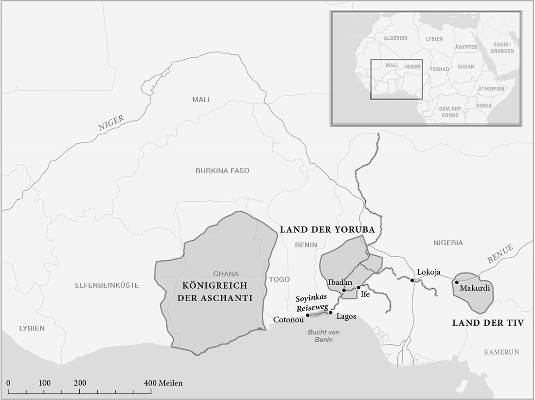Karte 1: Westafrika: Das historische Königreich der Aschanti, das Land der Yoruba, das Land der Tiv und Wole Soyinkas Reiseweg von Cotonou nach Lagos