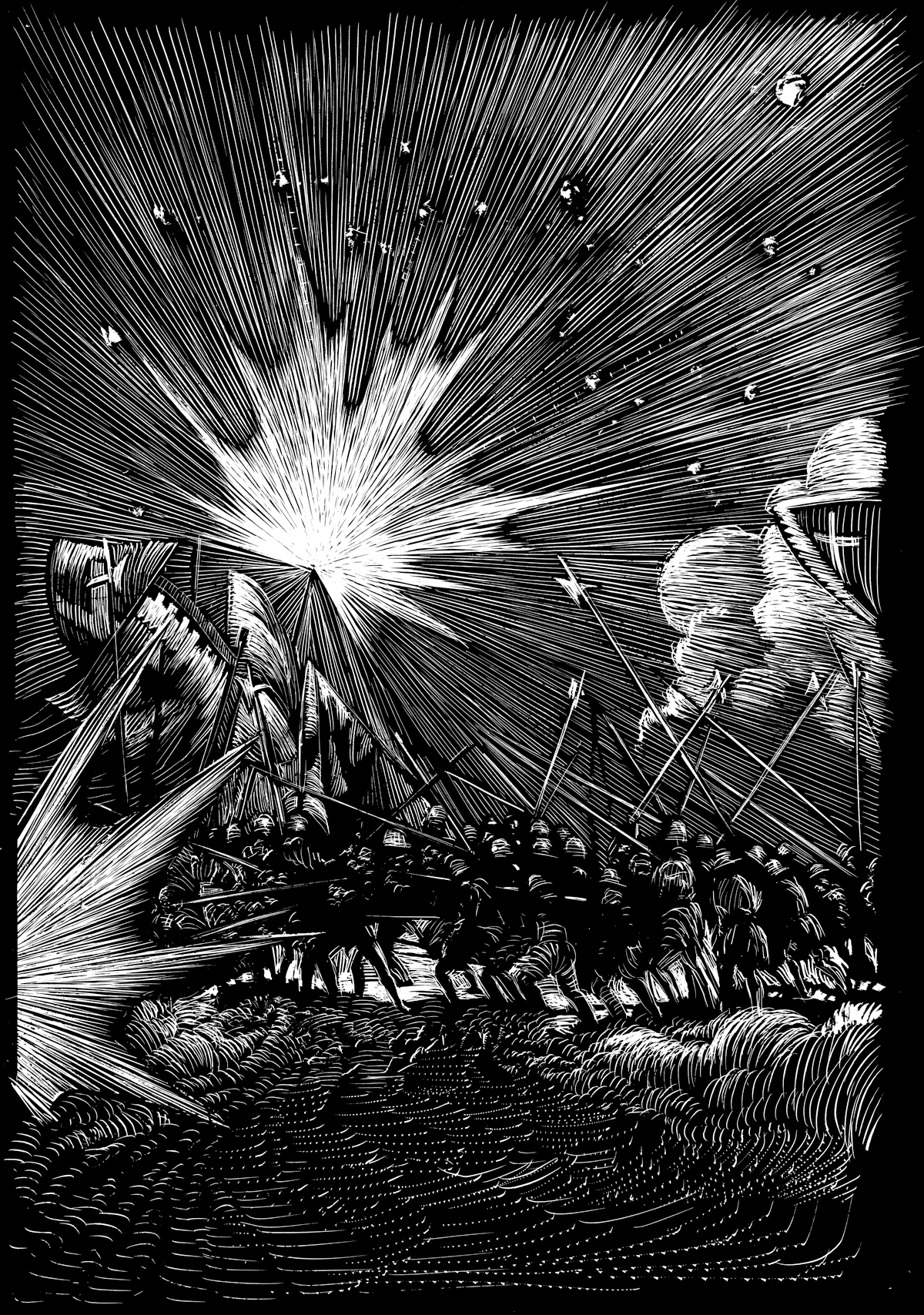 Mit blinzelndem Auge sah der Alte unter den weißen Buschbrauen hervor und schaute träumerisch im Geiste die stürmenden Schlachthaufen, die fliegenden Fahnen, niedergeworfenen Feinde, die brennenden Gehöfte, üppigen Quartiere, fremdländischen Frauen und die silbergefüllten Beutel.
