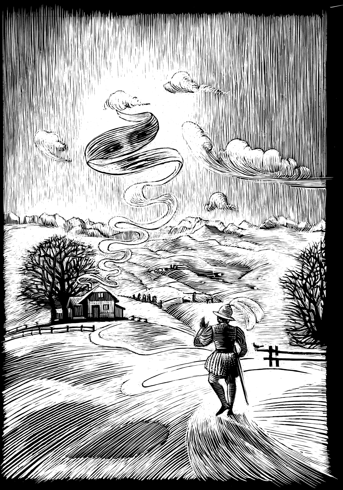Erschreckt horchte der jüngere Kriegsmann auf und verlangte näheren Bericht über diese abenteuerlichen Dinge, worauf der Alte ihm in seiner Weise erzählte, was er von dem wiedertäuferischen Treiben wusste, das insbesondere im Grüninger Amte und in der Gegend des Bachtelberges sich ausgebreitet hatte. Er schloss die Erzählung, zu seiner eigenen Narrheit zurückkehrend, mit der Ermahnung, der Junge solle nicht in dieses heimische Wirrsal hinein, sondern wieder fort und zu den Kriegsscharen des Königs Franziskus gehen, wo es Scharten auszuwetzen und neues Glück zu erjagen gelte.
