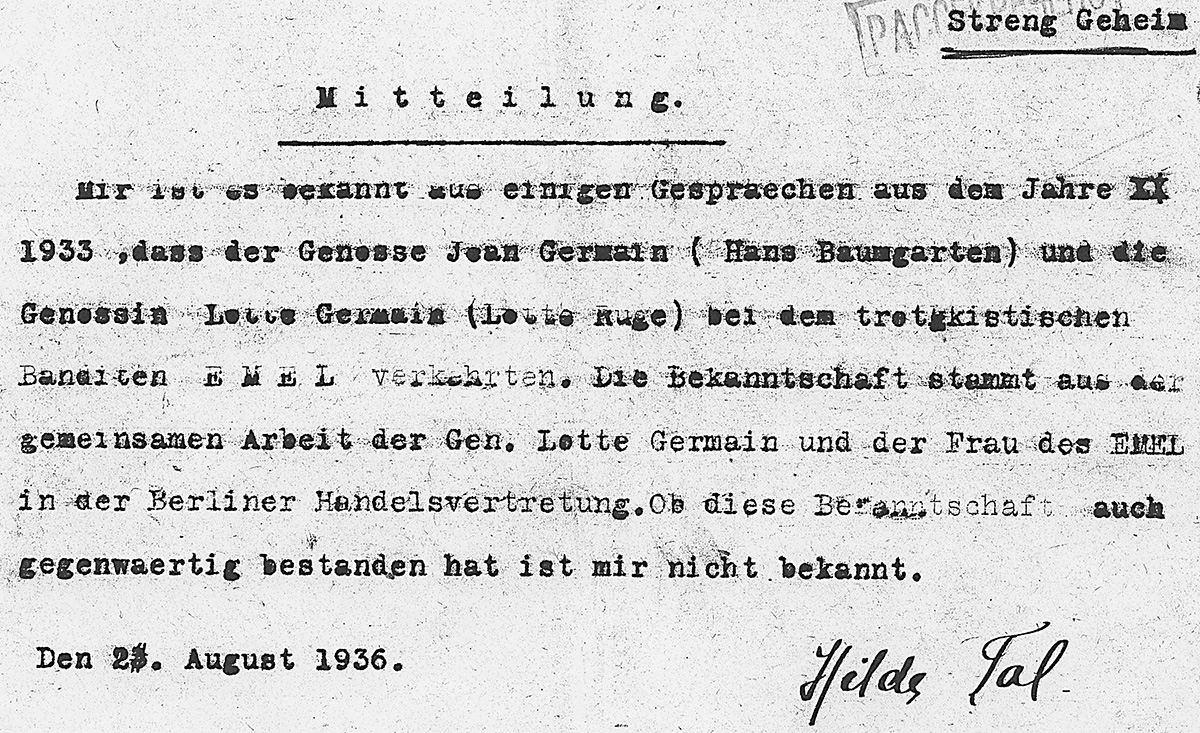 In der Nacht vom 20. auf den 21. August 1936 entdeckt Charlotte Germaine, wie sie sich neuerdings nennt, in der Deutschen Zentralzeitung unter den sechzehn Angeklagten in der Strafsache des trotzkistisch-sinowjewistischen terroristischen Zentrums den Namen M. Lurie.