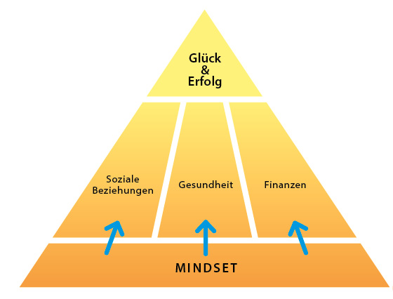 Im Prinzip lassen sich die Komponenten von Glück und Erfolg in drei große Oberbereiche einteilen. Da sind als Erstes die sozialen Beziehungen. Der Mensch ist ein soziales Wesen und interagiert mit anderen Menschen. Sei es der Partner, Freunde, Familie oder auch Kollegen, die sozialen Beziehungen und das Umfeld haben einen großen Einfluss auf uns. Der nächste Bereich ist eher materieller Natur, er umfasst finanziellen und beruflichen Erfolg. Also die Geldebene. Man will sich ja etwas leisten können, und Geld bedeutet auch immer Sicherheit. Sicherheit ist wie Essen und Trinken ein Grundbedürfnis des Menschen, also ein nicht zu vernachlässigender Aspekt. Und das letzte große Thema ist natürlich die Gesundheit. Wenn man krank ist, macht das Leben weniger Spaß, das erklärt sich von selbst. Damit hätten wir die drei Oberbereiche benannt. (Man könnte auch noch einen vierten Schwerpunkt hinzunehmen, den man am ehesten als Spiritualität oder inneres Glück bezeichnen könnte. Dieser Bereich ist in unseren Augen grundsätzlich auch nicht zu vernachlässigen, aber da wir dieses Buch auf Fakten basieren lassen wollen, haben wir diesen grenzwissenschaftlichen Bereich bewusst außen vor gelassen. Dennoch, alles ist möglich, wir wissen nur, dass wir nichts wissen. Bloß weil etwas [noch] nicht wissenschaftlich nachweisbar ist, heißt das nicht, dass es nicht existiert.) Das Fundament all dieser Oberthemen bildet das Mindset, also die generelle Denkweise. Das eigene Denken ist die Basis von allem, alles fängt bei euch selber an. Ein gutes Mindset, das durch eigenständiges Denken und selbstverantwortliches Handeln geprägt ist, führt fast schon zwangsläufig zu Erfolg in den drei Bereichen.