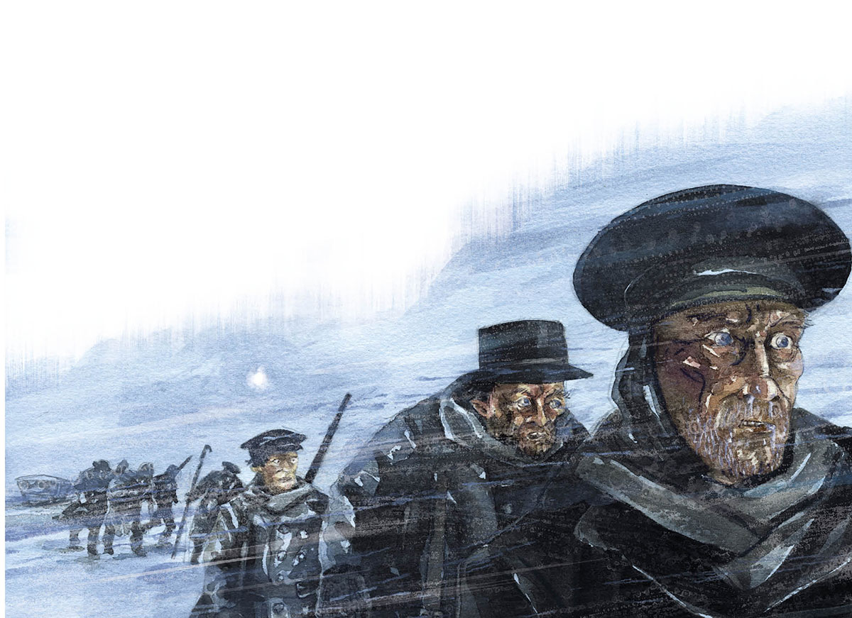 La refracción de la luz quemaba los ojos, la nieve, áspera como la arena, provocaba heridas en la piel, agrietaba los labios, y era común tener que amputar los dedos de los pies o de las manos por el efecto de la congelación.