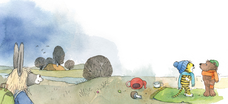 Der kleine Tiger und der kleine Bär wohnten in einem gemütlichen Haus am Fluss, und das Leben war schön. Tagsüber gingen sie in den Wald Pilze finden. Aber eigentlich fand sie nur der kleine Bär, denn der kleine Tiger lümmelte lieber ein wenig herum. Spielte mit der Ameise Verstecken und verlor immer. Oder schickte den Fuchs in die falsche Richtung und gewann immer. Herumlümmeln ist mindestens genauso schwer wie Pilze finden. Im Winter aber war es den Pilzen zu kalt zum Wachsen. Wie gut, dass der kleine Bär einen ganzen Schuppen voll gesammelt hatte.
